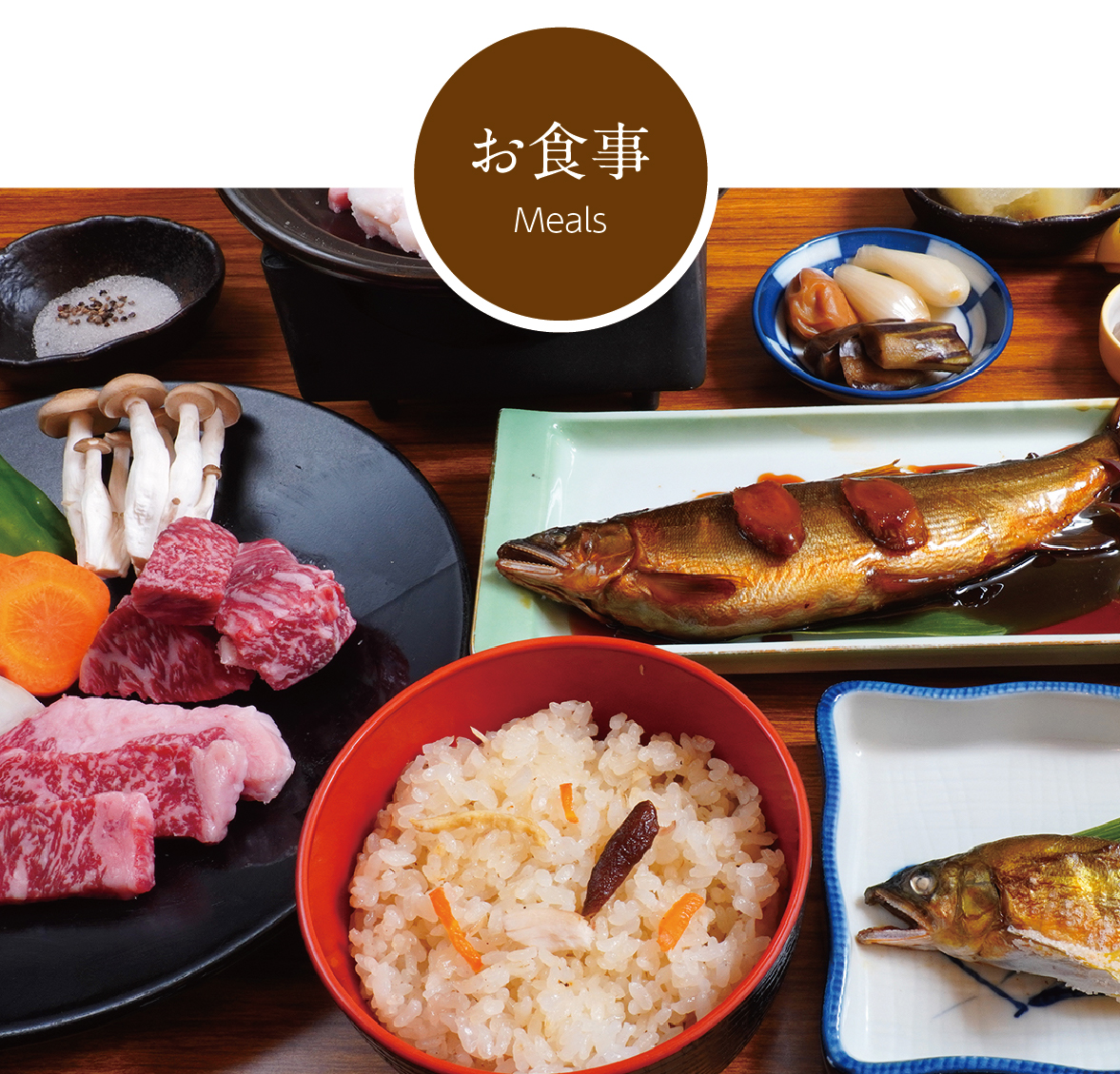 温泉のほかには料理が自慢!レストランでは、アユの塩焼きなど、川魚料理をはじめ、バラエティに富んだメニューをご用意しています。