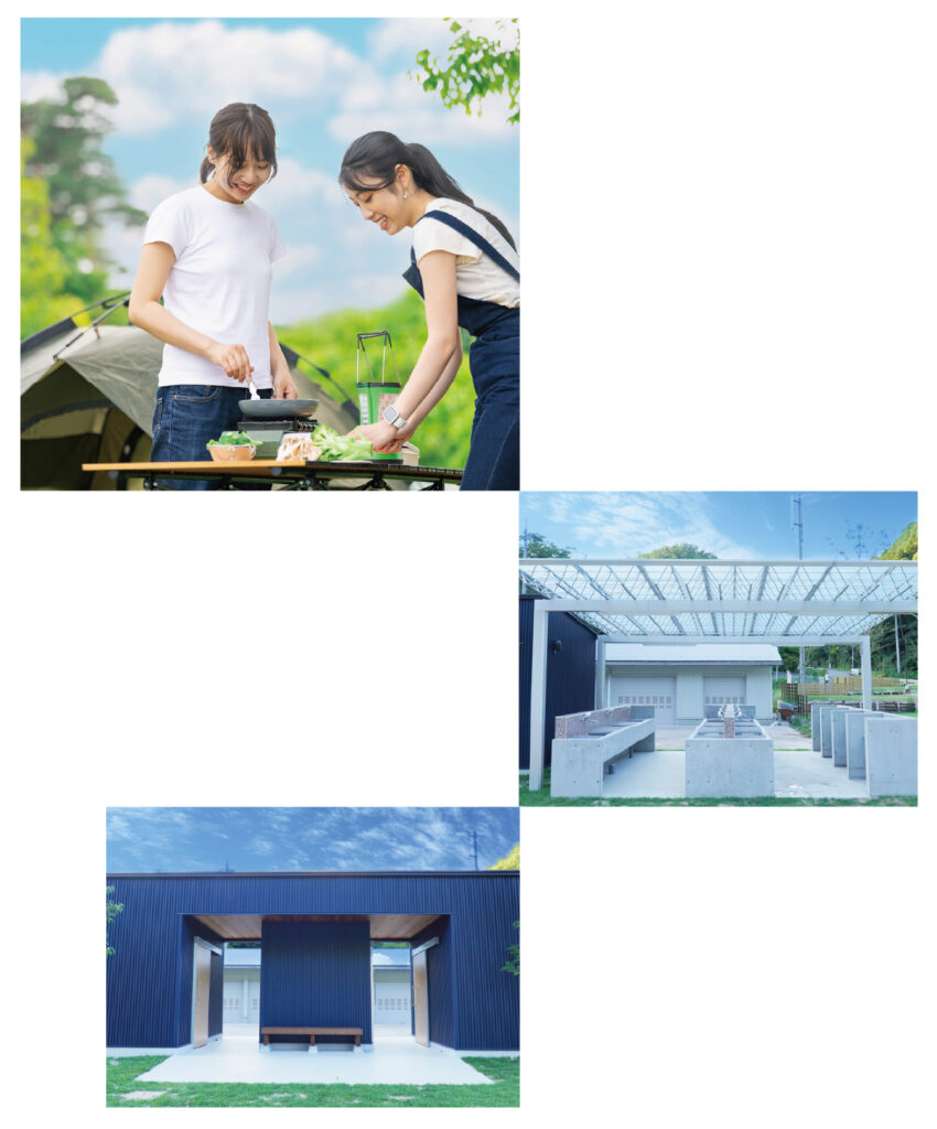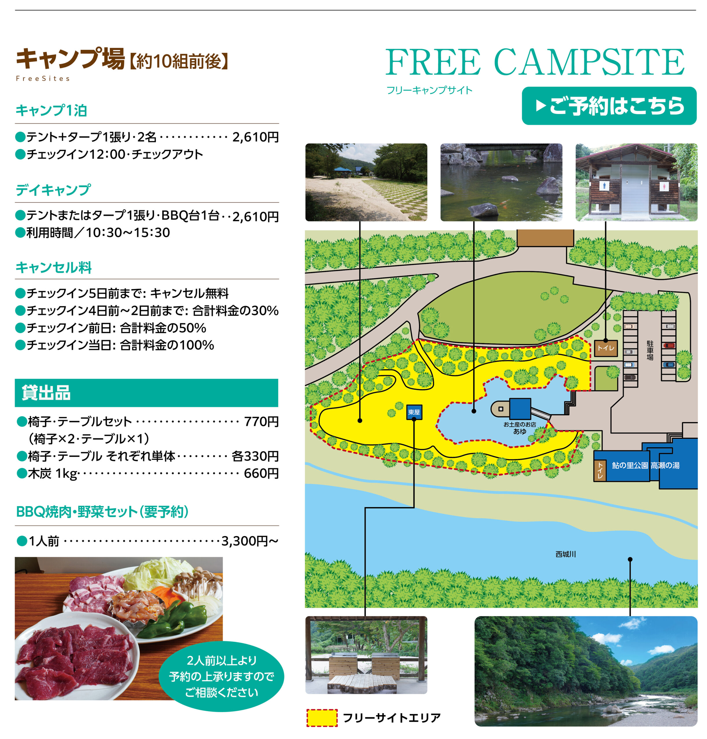 専用のトイレ、炊事棟があり、各サイトには駐車スペースと電源を備えています。