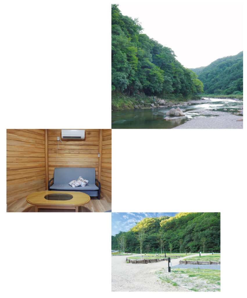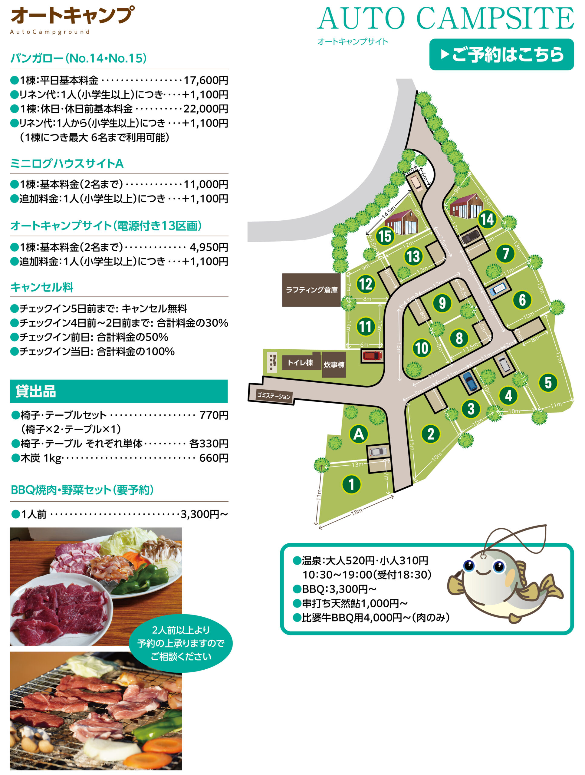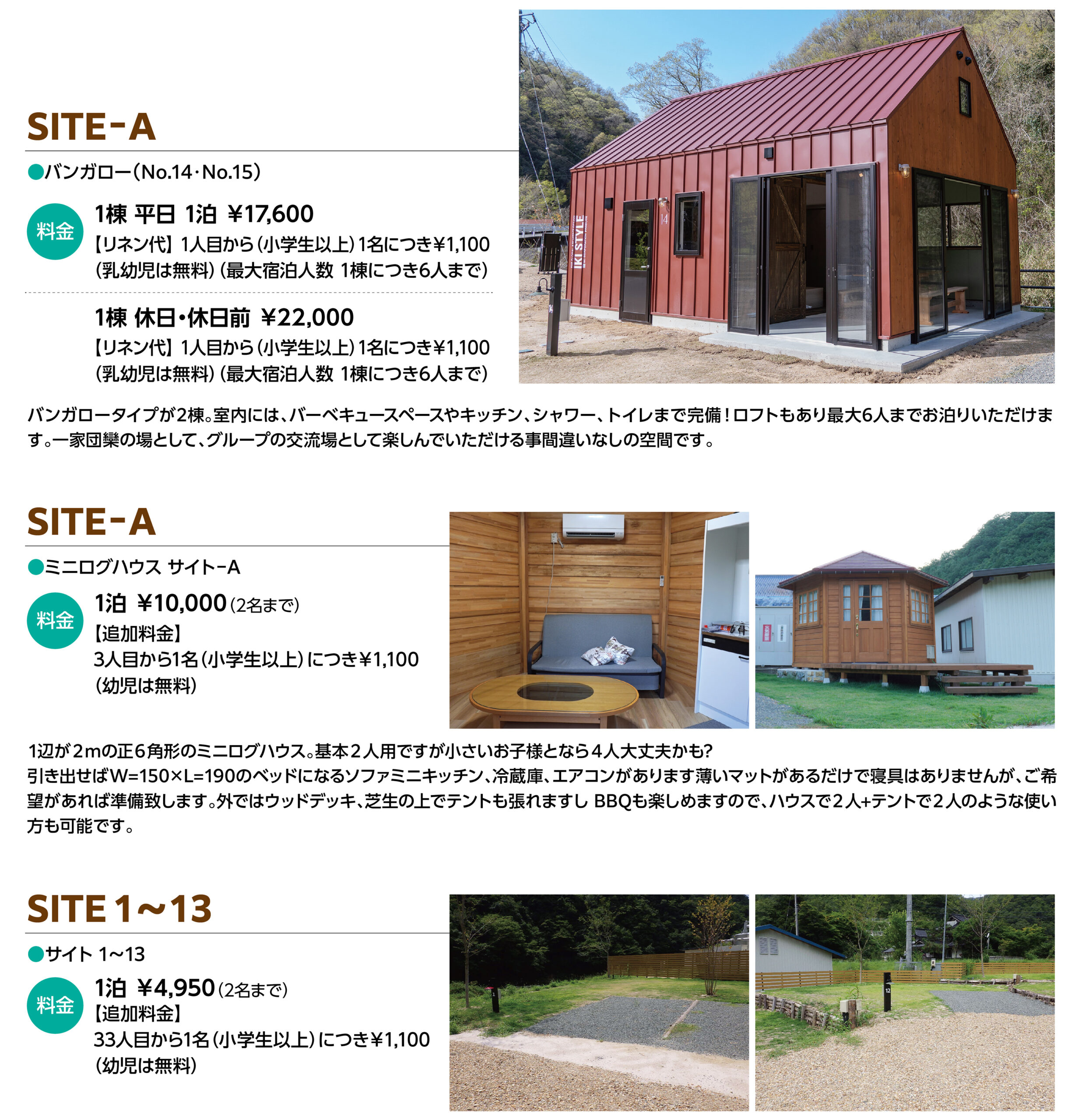 オートキャンプサイトにはバンガロー2棟、ミニログハウス1棟、区画サイトが13区画あります。